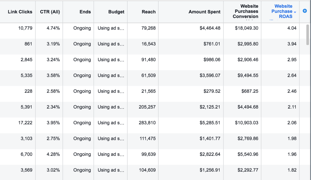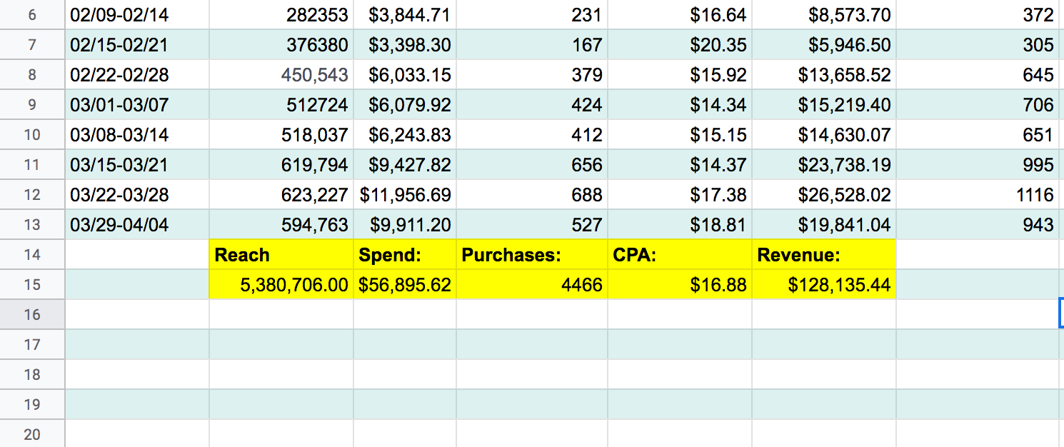 Client's return on ad spend from Facebook. Our best campaign spent $84,000 and brought in $286,000+... Not too shabby!